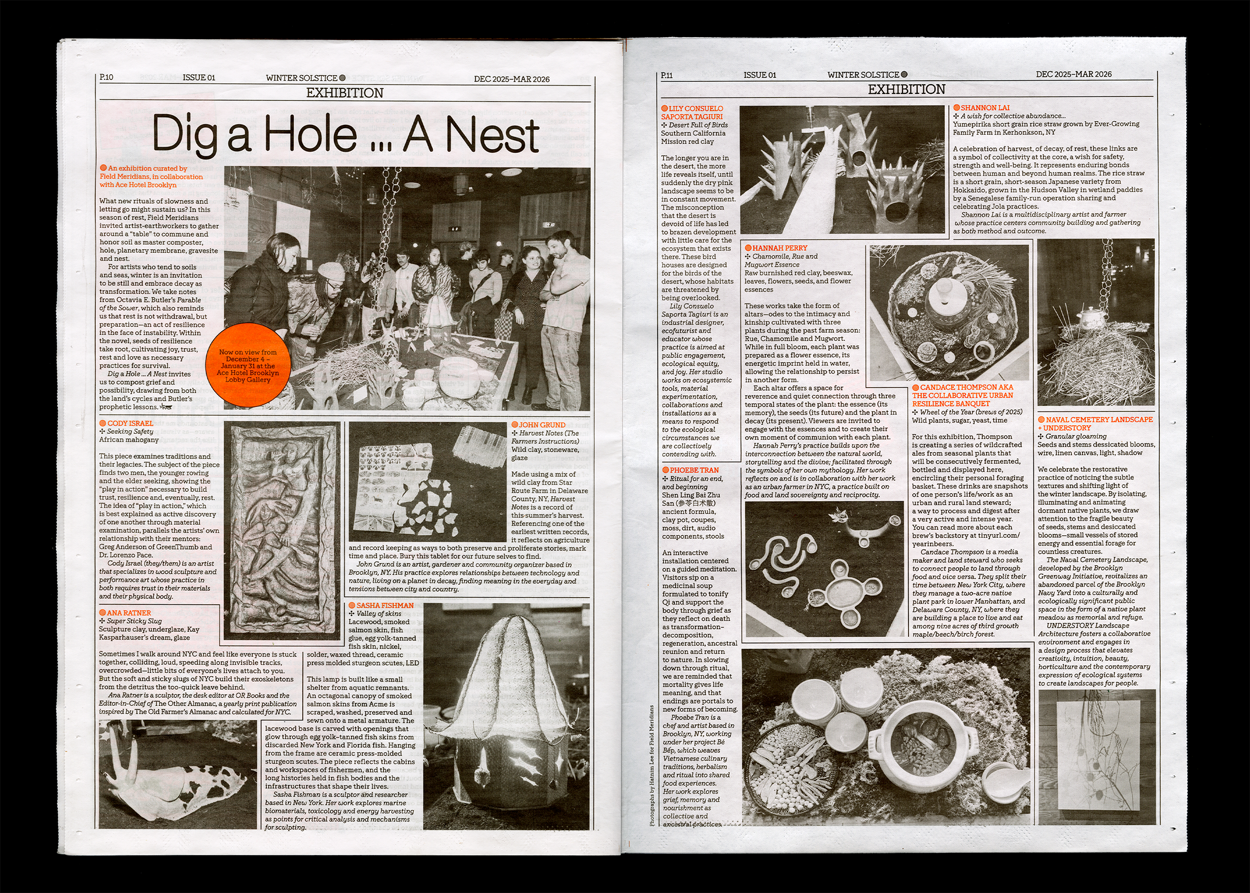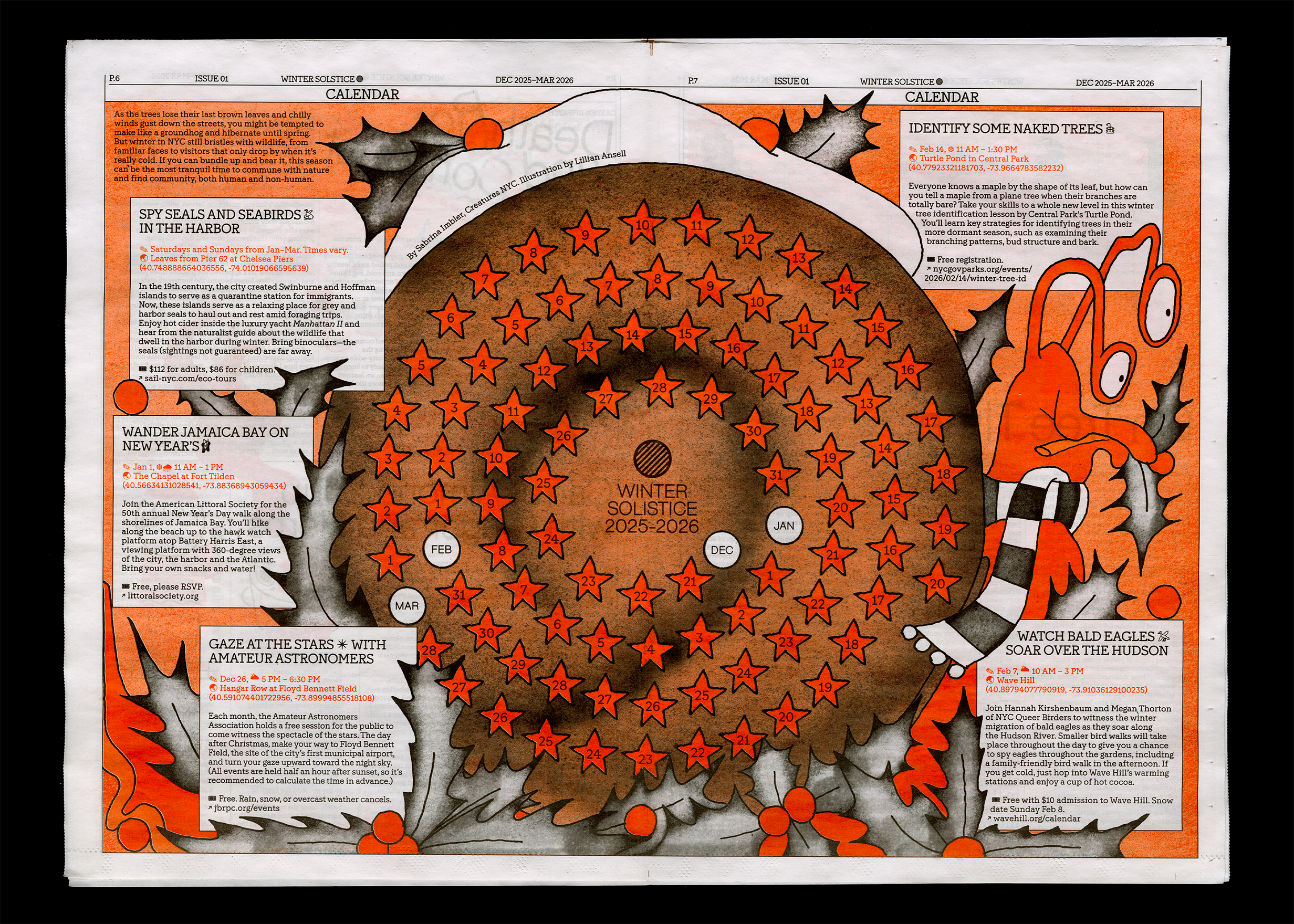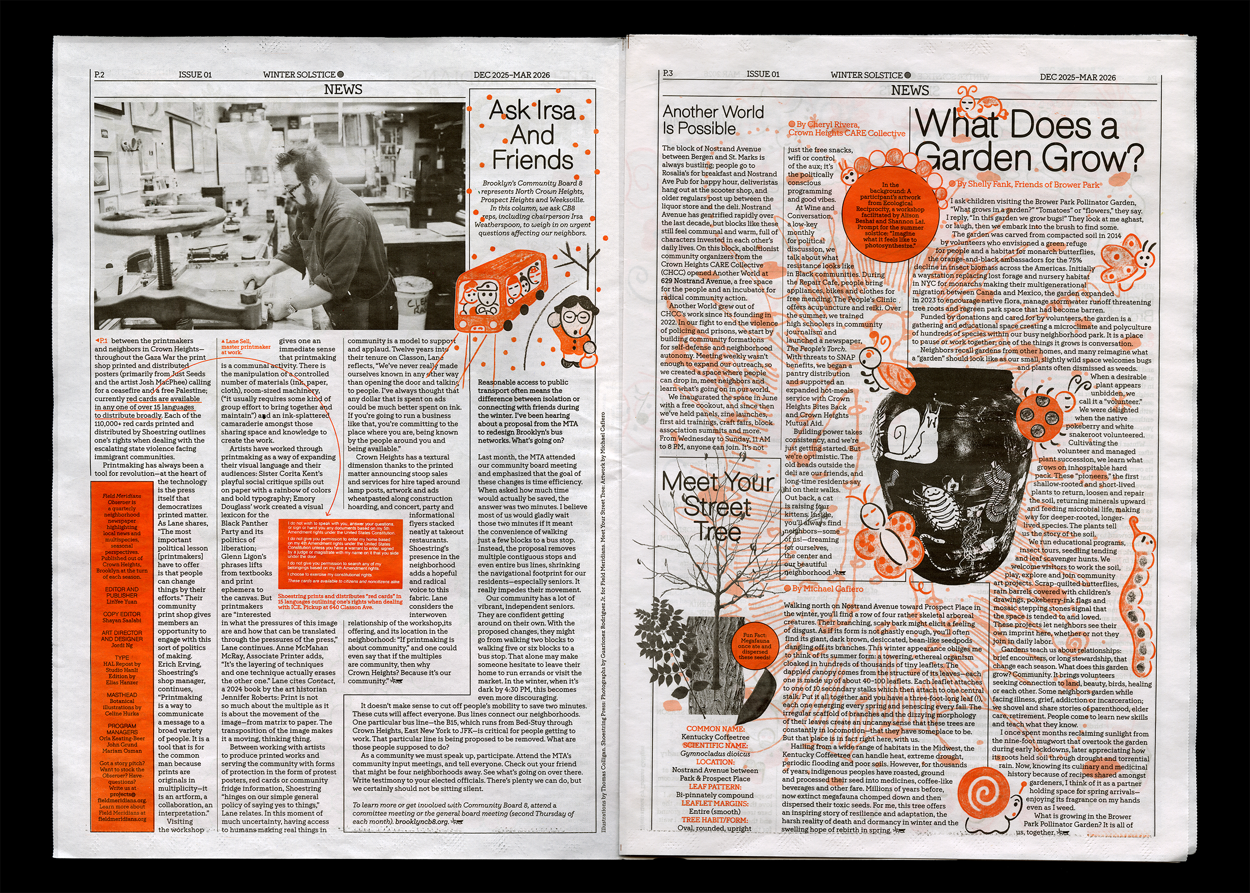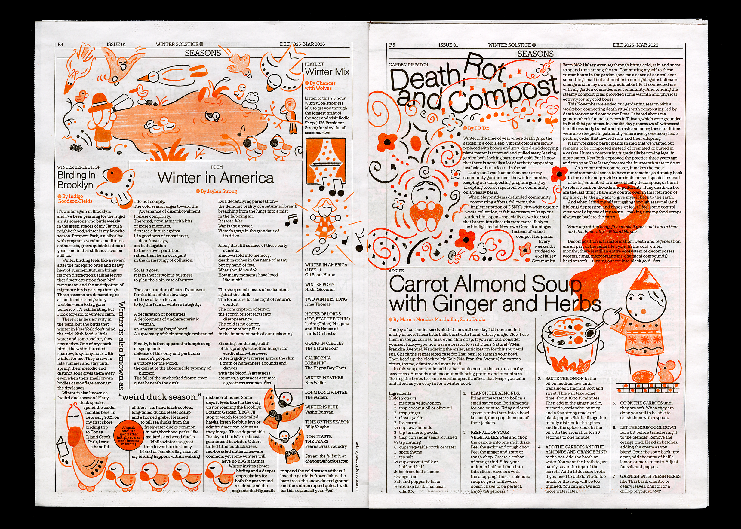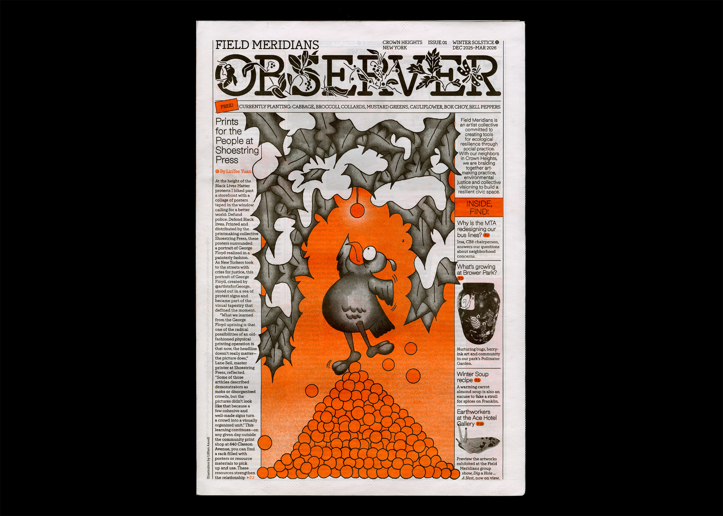 Design and art direction for the Field Meridians Observer, a quarterly neighborhood tabloid newspaper highlighting local news, ecosystems, and multispecies. The Observer is published at the turn of each season and distributed for free to the Crown Heights community. Our first issue is tied to the winter solstice: inside, find a warming soup recipe, the joy of winter birding, and a calendar of the season’s best activities round a snail’s snowy shell. Printed in black and an orange spot color.