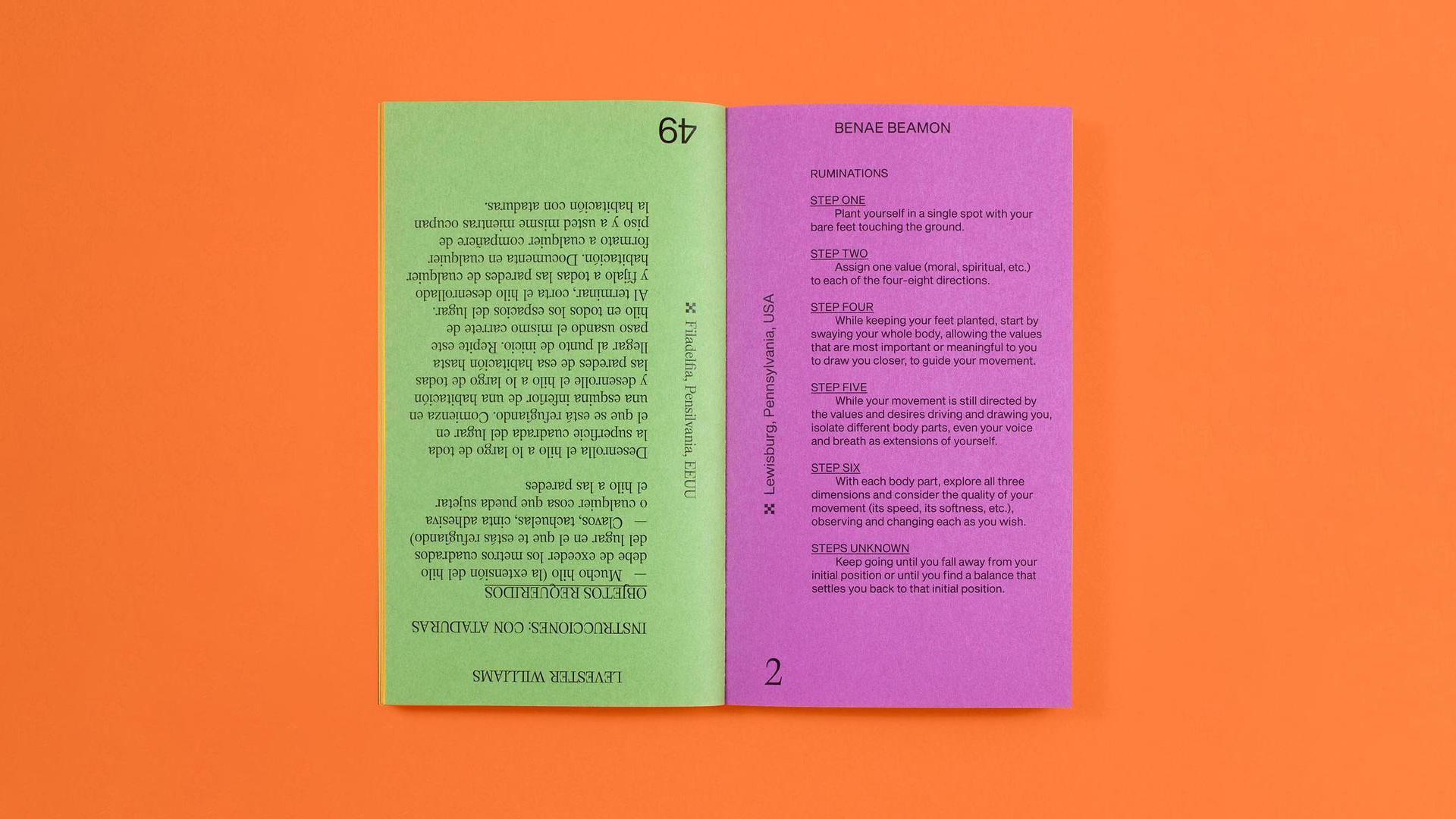 Publication design for Artist in Residence, a bilingual—and dare I say palindromic?—book of performance prompts that can be performed at home. It can be read front-to-back in English, or back-to-front in Spanish. Printed on colored stocks that have been mixed in at random and featuring a letter-pressed cover.