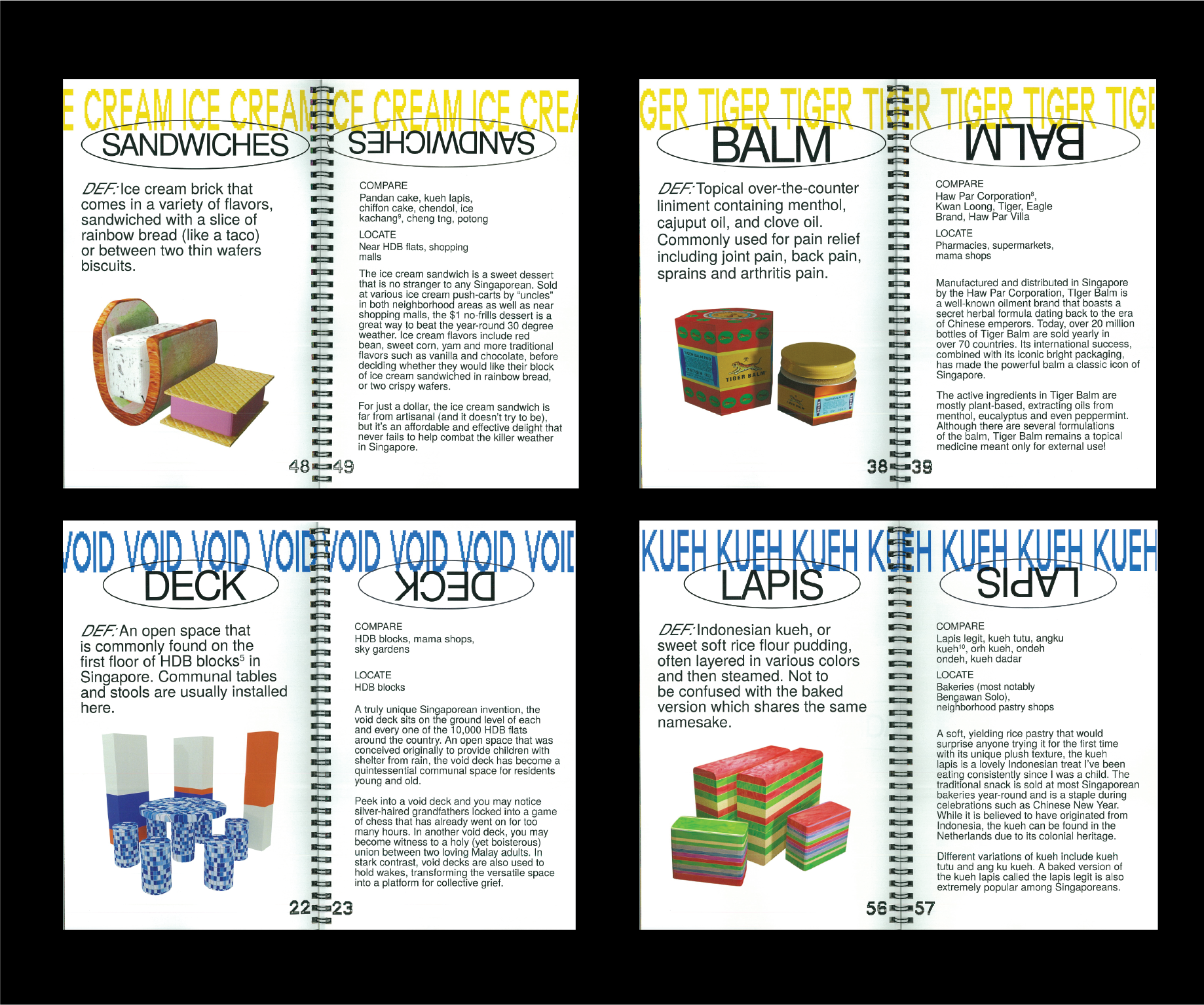 Inspired in part by Stefanie Tam’s 3D Craiglist Product Catalogue, “Help Me Chope Seat, Can Or Not?” is a list of 10 symbols that reflect Singaporean culture, ranging from childhood snacks to somewhat distasteful habits that Singaporeans tend to portray in public. The title of the book is in Singlish, which is a form of broken English that majority of Singaporeans communicate in. To “chope seat” is to reserve a seat (usually with a tissue packet) at a hawker centre before buying food. The book seeks to break down the idiosyncrasies that make up Singapore’s young and fledging identity. I’ve chosen to represent each object in an abstract yet simple way, isolating it from its usual habitats and instead extrapolating it into different worlds and backgrounds. I’ve also made animated posters for each item that shares the same colorful identity that the book highlights.